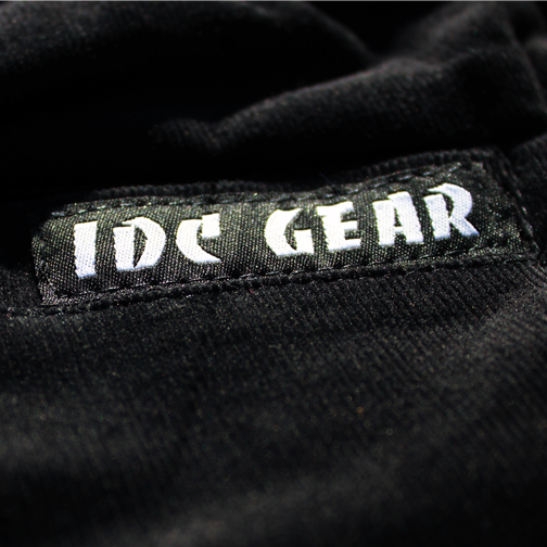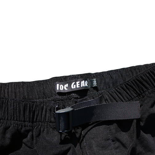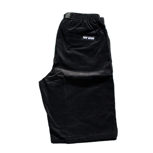 Constructed from Black Corduroy, the "DONT CARE" shorts feature elastic waistband, strap buckle closure, front pockets, back right pocket, "IDC GEAR" logo on the back right pocket, and lower right knee. Hand Made Shorts by IDC GEAR.